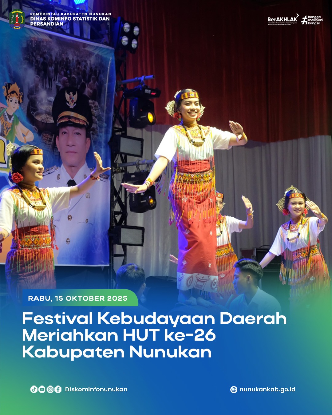 Nunukan, SIMP4TIK - Suasana malam di GOR Dwikora Nunukan tampak ramai dan penuh semangat saat berlangsungnya Festival Kebudayaan Daerah pada Selasa (14/10/2025) malam. Acara ini berlangsung mulai pukul 19.30 hingga 22.00 WITA, dan menjadi salah satu rangkaian kegiatan yang ditunggu-tunggu masyarakat.