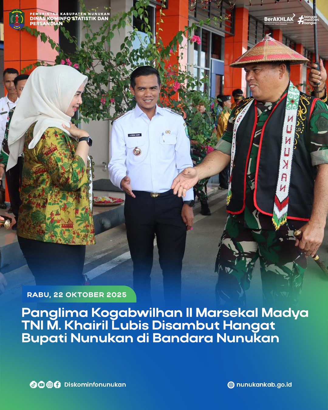 Nunukan, SIMP4TIK – Panglima Komando Gabungan Wilayah Pertahanan II (Pangkogabwilhan II) Marsekal Madya TNI M. Khairil Lubis tiba di Kabupaten Nunukan dalam rangka kunjungan kerja meninjau wilayah perbatasan Indonesia–Malaysia. Kedatangannya disambut hangat oleh Bupati Nunukan H. Irwan Sabri di Bandar Udara Nunukan, Rabu (22/10/2025).