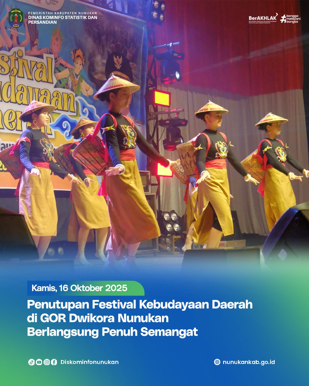 Nunukan, SIMP4TIK - Festival Kebudayaan Daerah kembali digelar di GOR Dwikora Nunukan pada Rabu, 16 Oktober 2025. Kegiatan berlangsung mulai pukul 19.30 hingga 22.00 WITA, menjadi hari ketiga sekaligus penutup rangkaian festival kebudayaan daerah dalam rangka memeriahkan Hari Ulang Tahun ke-26 Kabupaten Nunukan sebelum dilanjutkan dengan lomba fashion show busana adat tradisional pada hari berikutnya.