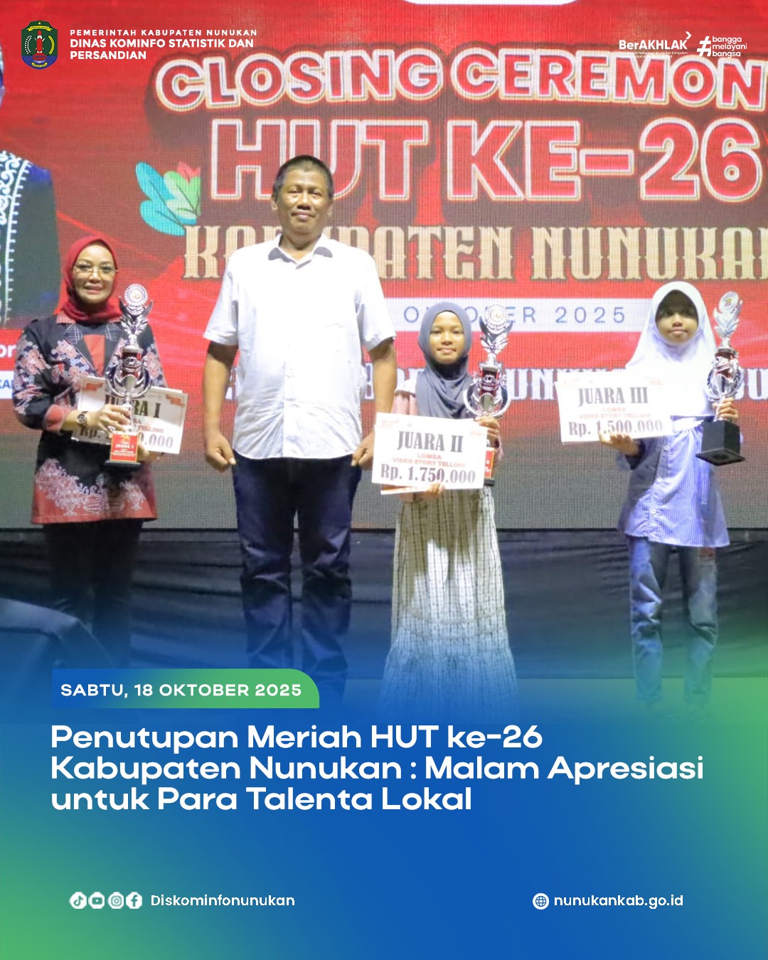 Dengan berakhirnya seluruh rangkaian kegiatan HUT ke-26, Pemerintah Kabupaten Nunukan berharap semangat kebersamaan yang telah terjalin dapat terus terpelihara dalam mendukung pembangunan Nunukan yang lebih maju, kreatif, dan sejahtera.(*)