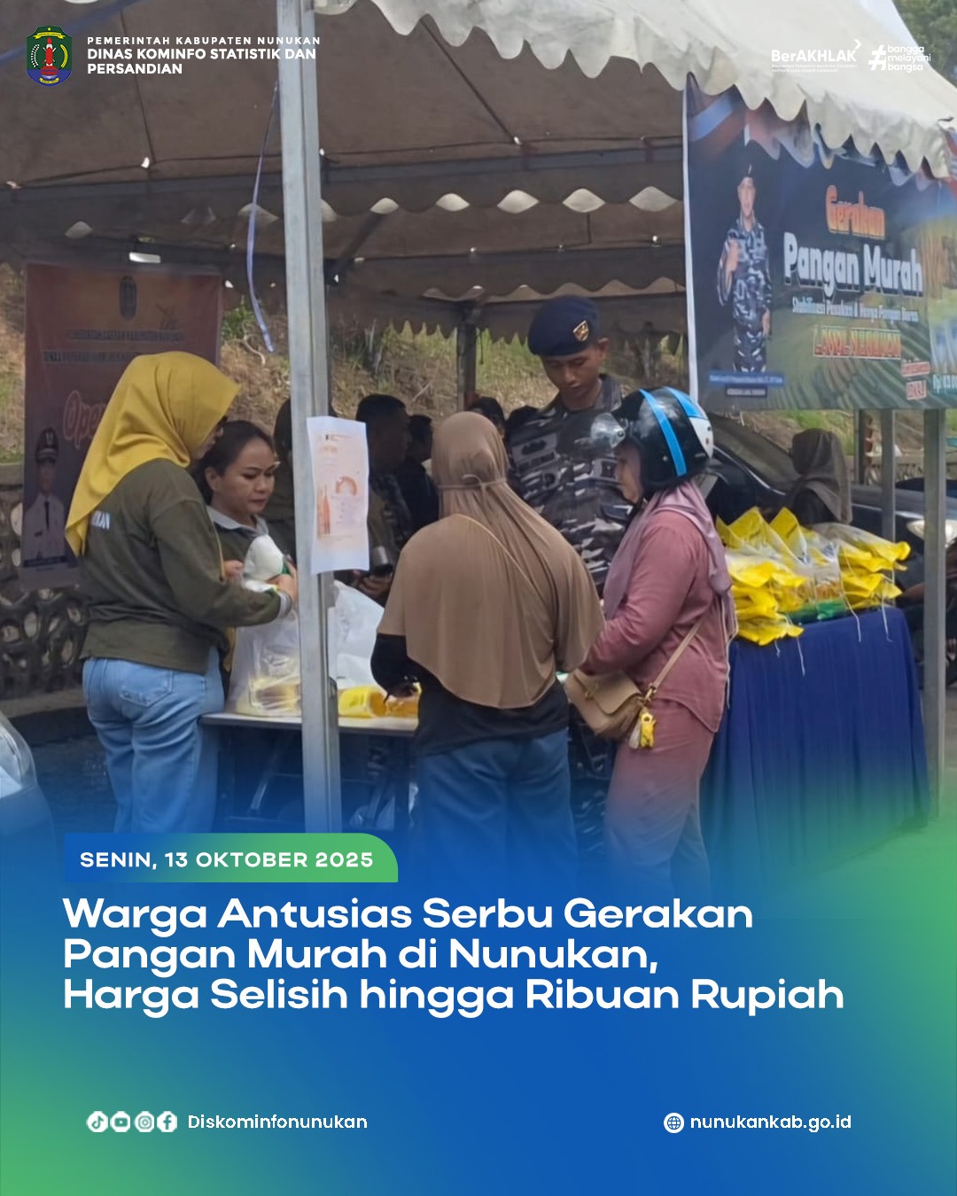 Nunukan, SIMP4TIK – Dinas Ketahanan Pangan dan Pertanian Kabupaten Nunukan menggelar Gerakan Pangan Murah dalam rangka memperingati Hari Ulang Tahun Kabupaten Nunukan ke-26, kegiatan ini juga sekaligus bertujuan untuk menjaga stabilitas pasokan dan harga pangan di wilayah perbatasan tersebut.